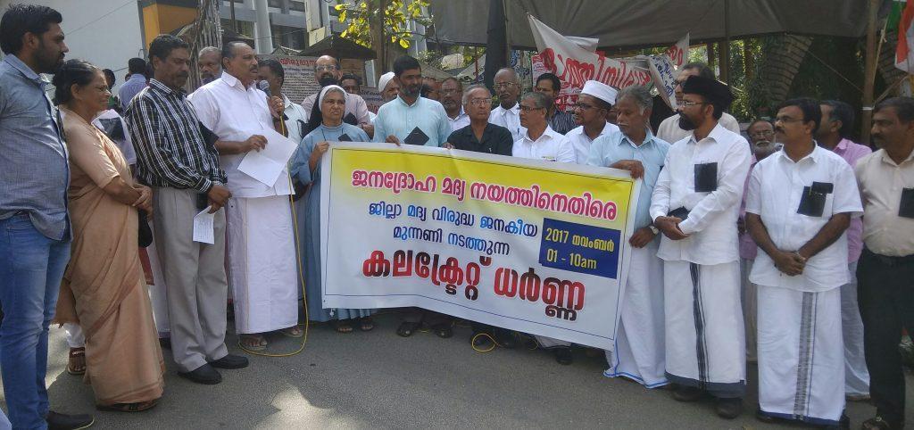 ജനദ്രോഹ മദ്യ നയത്തിനെതിരെ ജില്ലാ മദ്യവിരുദ്ധ ജനകീയ മുന്നണി കലട്രേറ്റിനു മുന്നിൽ ധർണ്ണ നടത്തി. കറുത്ത ബാഡ്ജ് ധരിച്ച് കൽപ്പറ്റയിലും സംസ്ഥാനത്തെ എല്ലാ ജില്ലകളിലും പ്രതിരോധ ധർണ്ണ നടത്തി. കോഴിക്കോട് ജില്ലയിൽ കറുത്ത വസ്ത്രം ധരിച്ചും പ്രതിക്ഷേധിച്ചു. മദ്യ വിരുദ്ധത്തിന് എല്ലാ ജനങ്ങളും ജാതി മത ഭേതമന്യേ ധർണ്ണയിൽ അണിനിരന്നു. കൽപ്പറ്റ കലക്ട്രേറ്റിന് മുമ്പിൽ സമരം മുൻ എം.എൽ.എ. എൻ.ഡി. അപ്പച്ചൻ ഉദ്ഘാടനം ചെയ്തു. സിസ്റ്റർ ജോവിറ്റ അധ്യക്ഷത വഹിച്ചു.