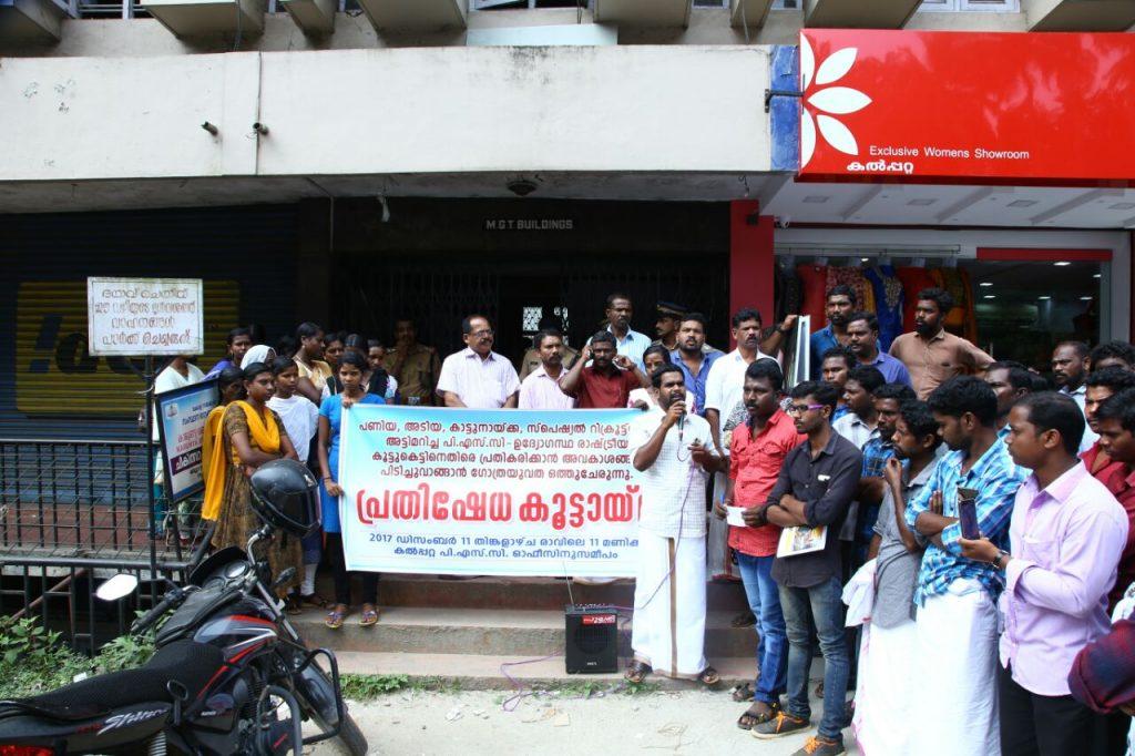 കൽപ്പറ്റ: പട്ടികവർഗ്ഗ വിഭാഗത്തിലെ അടിയ , പണിയ ,കാട്ടുനായ്ക്ക വിഭാഗങ്ങളിൽപ്പെട്ട യുവജനങ്ങൾക്ക് പൊലീസ് ,എക്സൈസ് സേനകളിൽ നിയമനം നൽകുന്നതിന് വേണ്ടി സർക്കാർ പുറത്തിറക്കിയ ഉത്തരവ് അട്ടിമറിച്ച് ഈ വിഭാഗങ്ങളെ ഒഴിവാക്കി നിയമനം നടത്താൻ പി.എസ്.സി. ശ്രമിക്കുന്നുവെന്ന് ആരോപിച്ച് പി.എസ്.സി.ഓഫീസിലേക്ക് മാർച്ചും ധർണ്ണയും നടത്തി. ഈ മൂന്ന് വിഭാഗങ്ങളിൽ നിന്നായി നാലായിരത്തോളം പേർ അപേക്ഷ സമർപ്പിച്ചിരുന്നു. കായിക ക്ഷമതാ പരീക്ഷയുടെ ലിസ്റ്റ് പ്രസിദ്ധീകരിച്ചപ്പോൾ പട്ടികവർഗ്ഗ വിഭാഗത്തിൽ മുന്നോക്കം നിൽക്കുന്ന വിഭാഗങ്ങളിലെ യുവാക്കൾക്കാണ് പരിഗണന കിട്ടിയത്. പി. എസ്.സി. വിതരണം ചെയ്യേണ്ട കായിക ക്ഷമത പരീക്ഷയുടെ മെമ്മോ വിതരണം ചെയ്തത് പട്ടികവർഗ്ഗ വികസന വകുപ്പാണ്. അവഗണനയിൽ പ്രതിഷേധിച്ച് ഗോത്ര ,കേരള പണിയസമാജം, കേരള ആദിവാസി ഫോറം, കാട്ടുനായ്ക്ക സമാജം ,അടിയ യുവസമാജം എന്നിവയുടെ സംയുക്താഭിമുഖ്യത്തിൽ കൽപ്പറ്റയിലെ ജില്ലാ പി.എസ്.സി. ഓഫീസിലേക്ക് മാർച്ചും ധർണ്ണയും നടത്തി. ഉദ്യോഗാർത്ഥികൾ സമർപ്പിച്ച അപേക്ഷകളുടെ പകർപ്പുകൾ സമരക്കാർ കത്തിച്ചു.