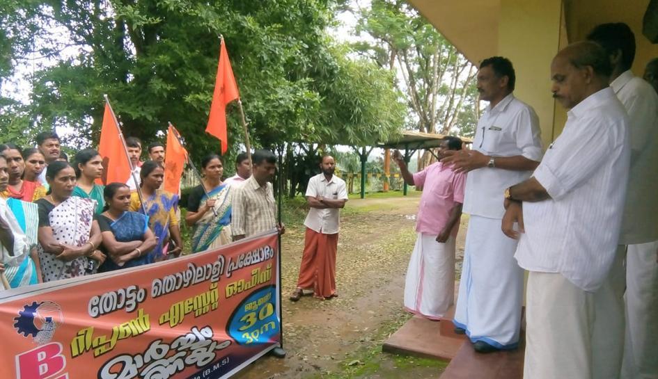 കല്‍പ്പറ്റ:തോട്ടം തൊഴിലാളി യൂണിയൻ ഫെഡറേഷനുകൾ സംയുക്തമായി ലേബർ കമ്മീഷണർക്കു സമർപ്പിച്ച ഇരുപത്തിയൊൻപത്   ഡിമാന്റുകൾ പി.എൽ.സി.യോഗങ്ങളിൽചർച്ച ചെയ്യുകയോ നടപ്പിലാക്കുകയോ ചെയ്യാത്തതിൽ പ്രതിഷേധിച്ചു  വയനാട് എസ്റ്റേറ്റ് മസ്ദുർ സംഘം ( ബി. എം.എസ്) പൊഡാർ പ്ലാന്റേഷൻ റിപ്പൺ എസ്റ്റേറ്റ് ഓഫീസിലേക്ക് തൊഴിലാളികളുടെ പ്രതിഷേധ മാർച്ചും ധർണ്ണയും നടത്തി. ധർണ്ണ ബി.എം.എസ്. ജില്ലാ സെക്രട്ടറിയും, ഡബ്ല്യു.ഇ.എം.എസ് (ബി.എം.എസ്) ജനറൽ സെക്രട്ടറിയുമായ പി.കെ.മുരളീധരൻ ഉദ്ഘാടനം ചെയ്തു. തോട്ടം തൊഴിലാളികളുടെ വേതനം 600 രൂപയാക്കുക, മുഴുവൻ താൽക്കാലിക തൊഴിലാളികളേയും സ്ഥിരപ്പെടുത്തുക, ഇ.എസ്.ഐ പദ്ധതിയിൽ ഉൾപ്പെത്തി തൊഴിലാളി കുടുംബങ്ങൾക്ക് ആധുനിക ചികിത്സ ലഭ്യമാക്കുക, വാസയോഗ്യമായ വീടുകൾ നിർമ്മിച്ചു നൽകുക, മരണാനന്തര ചെലവ് 10000 രൂപയാക്കുക, ഗ്രാറ്റ്വിറ്റി 30 ദിവസത്തെ ശമ്പളം കണക്കാക്കി നൽകുക, ഓവർ കിലോ റെയ്റ്റ് 75% വർദ്ധിപ്പിക്കുക, ശുദ്ധമായ കുടിവെള്ളം ലഭ്യമാക്കുക തുടങ്ങിയ 29ആവശ്യങ്ങളുന്നയിച്ചുകൊണ്ടായിരുന്നു സമരം.മാനേജ്മെന്റിന് ഗുണകരമായ റിട്ട: ജസ്റ്റിസ് എൻ.കൃഷ്ണൻ നായർ കമ്മീഷൻ റിപ്പോർട്ട് നടപ്പാക്കുവാൻ പിണറായി വിജയൻസർക്കാർ തയ്യാറാകുമ്പോൾ തൊഴിലാളികളുടെ ന്യായമായ ആവശ്യങ്ങൾ ഒന്നുപോലും നടപ്പാക്കുവാൻ തോട്ടം ഉടമകളോട് നിർദ്ദേശിക്കുവാൻ തൊഴിൽ മന്ത്രിയോ, വ്യവസായ മന്ത്രിയോ, ധനമന്ത്രിയോ തയ്യാറാകാത്തത് പ്രതിഷേധാർഹമാണ്.ജില്ലയിൽ നാലു ദിവസങ്ങളിലായി നടത്തുന്ന സമരം ഒരു സൂചനയാണെന്നും, എ.പി.കെ.അനങ്ങാപാറനയമാണ് പി.എൽ.സി.യോഗങ്ങളിൽ കൈക്കൊള്ളുന്നതെങ്കിൽ വരും നാളുകളിൽ അനിശ്ചിതകാല പണിമുടക്ക് ഉൾപ്പെടെയുള്ള സമരത്തിന് നേതൃതം നൽകുവാൻ വയനാട് എസ്റ്റേറ്റ് മസ്ദൂർ സംഘം തയ്യാറാകുമെന്നും അദ്ദേഹം പറഞ്ഞു. നിലവിലെ 301 രൂപ വേതനത്തിൽ നിന്നും കേവലം 5 രൂപ വർദ്ധിപ്പിക്കാമെന്നും പകരം അദ്ധ്വാനഭാരം കൂട്ടണം എന്ന മാനേജ് നിലപാട് തോട്ടം തൊഴിലാളികളോടുള്ള പ രിഹാസവും വെല്ലുവിളിയാണ്. ധർണ്ണയിൽ ബി.എം.എസ്. ജില്ലാ വൈസ് പ്രസിഡന്റ് പി.ആർ.സുരേഷ്, യൂണിയൻ പ്രസി: എൻ.പി.ചന്ദ്രൻ ,കൃഷ്ണൻ ഓടത്തോട്, രവീന്ദ്രൻ, സി.ഉണ്ണികൃഷ്ണൻ, ഇ.എം.ഉണ്ണികൃഷണൻ, കെ.അപ്പൂട്ടി, കെ.മോഹനൻ തുടങ്ങിയ നേതാക്കൾ പ്രസംഗിച്ചു.