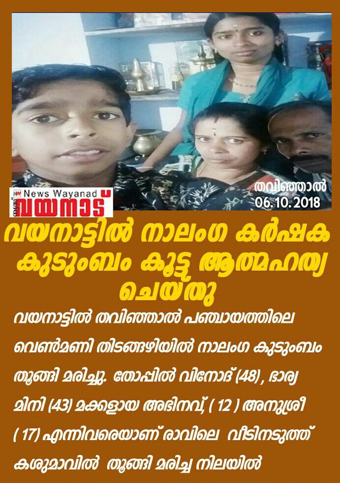 . തവിഞ്ഞാല് പഞ്ചായത്തിലെ വെണ്മണി തിടങ്ങഴിയില് തോപ്പില് വിനോദ്(48), ഭാര്യ മിനി (43), മക്കളായ അനുശ്രീ (17), അഭിനവ് (12) എന്നിവരെയാണ് ശനിയാഴ്ച വീടിനടുത്ത് കശുമാവില് തൂങ്ങി മരിച്ച നിലയില് കണ്ടെത്തിയത്. അയല്വാസിയായ മണ്ണല്ലൂര് ഷിജുവിന്റെ തോട്ടത്തിലെ മരത്തിലാണ് നാല് പേരെയും തൂങ്ങിയ നിലയില് കണ്ടെത്തിയത്. മരത്തിലെ താഴത്തെ ശിഖരത്തില് അനുശ്രീയും അഭിനവും തൊട്ട് മുകളിലെ മറ്റൊരു കൊമ്പില് മിനിയും ഏറ്റവും മുകളിലത്തെ കൊമ്പില് വിനോദും മരിച്ചനിലയിലാണ് നാട്ടുകാര് കണ്ടത്. തോട്ടത്തിന്റെ ഉടമ ഷിജു ഇന്ന് രാവിലെയാണ് ഇവരെ തൂങ്ങിയ നിലയില് കണ്ടത്. മരത്തിന് ചുവട്ടില് നിന്ന് മിനിയുടെ ബാഗും ശീതളപാനീയ കുപ്പികളും കണ്ടെത്തിയിട്ടുണ്ട്.