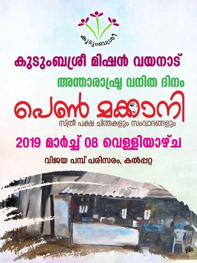 അന്താരാഷ്ട്ര വനിത ദിനത്തോടനുബന്ധിച്ച് കുടുംബശ്രീയുടെ പെണ്മക്കാനി കല്പ്പറ്റ വിജയ പമ്പ് പരിസരത്ത് നടത്തും. .തികച്ചും വ്യത്യസ്തമായ രീതിയില് ആണ് പരിപാടി സംഘടിപ്പിക്കുന്നത്.രാവിലെ മുതല് വൈകുന്നേരം വരെ പെണ്മക്കാനിയില് 5 രൂപക്ക് ചായയും 5 രൂപക്ക് കടിയും ലഭൃമാകും.സമൂഹത്തിന്റെ വിവിധ മേഖലകളിലുള്ളവര് അണിചേരുന്ന സ്ത്രീ പക്ഷ ചര്ച്ചകളും പെണ് മക്കാനിക്ക് കൂടുതല് നിറം നല്കും