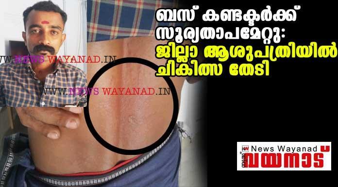 News Wayanad ബസ് കണ്ടക്ടർക്ക് സൂര്യതാപമേറ്റു: ജില്ലാ ആശുപത്രിയിൽ ചികിത്സ തേടി. March 26, 2019 0 By ന്യൂസ് വയനാട് ബ്യൂറോ മാനന്തവാടി: വയനാട് സ്വദേശിക്ക് സൂര്യാതാപമേറ്റു. മാനന്തവാടിയിൽ സ്വകാര്യ ബസ്സ് ജിവനക്കാരനായ നിരവില്പുഴ മട്ടിലയം ഓടയോട്ടില് രജീഷി(36) നാണ് പൊള്ളലേറ്റത്. ഇയാള് മാനന്തവാടി ജില്ലാ ആശുപത്രിയില് ചികിത്സ തേടി. Post navigation Previous: ഇബ്രാഹിം തെയ്ത്തൊടി എസ് .ടി .യു. പ്രസിഡണ്ട്: ജമാൽ അണിയാപ്രവൻ ജനറൽ സെക്രട്ടറി .Next: വീട്ടമ്മയെ കാണാതായതായി പരാതി. Also read News Wayanad വാൽപ്പാറയിൽ വാഹനാപകടം; ഒമ്പത് മലയാളികൾക്ക് ദാരുണാന്ത്യം April 17, 2026 0 News Wayanad കെ.ജെ. എൽദൊ അനുസ്മരണവും സെമിനാറും സംഘടിപ്പിക്കുന്നു April 17, 2026 0 News Wayanad ഹ്രസ്വകാല തൊഴിലധിഷ്ഠിത കോഴ്സുകള് പഠിക്കാം April 17, 2026 0 Leave a ReplyDefault Comments (0)Facebook Comments Leave a Reply Cancel replyYour email address will not be published. Required fields are marked *Comment * Name * Email * Website