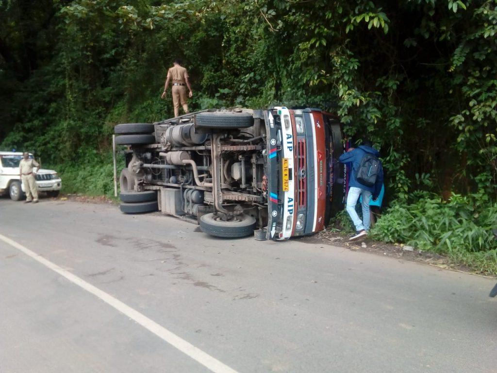 9.30നാണ് മറിഞ്ഞത്. ഡ്രൈവര്ക്ക് നിസാര പരുക്കേറ്റു. ഇവിടെ റോഡിന്റെ ഒരു