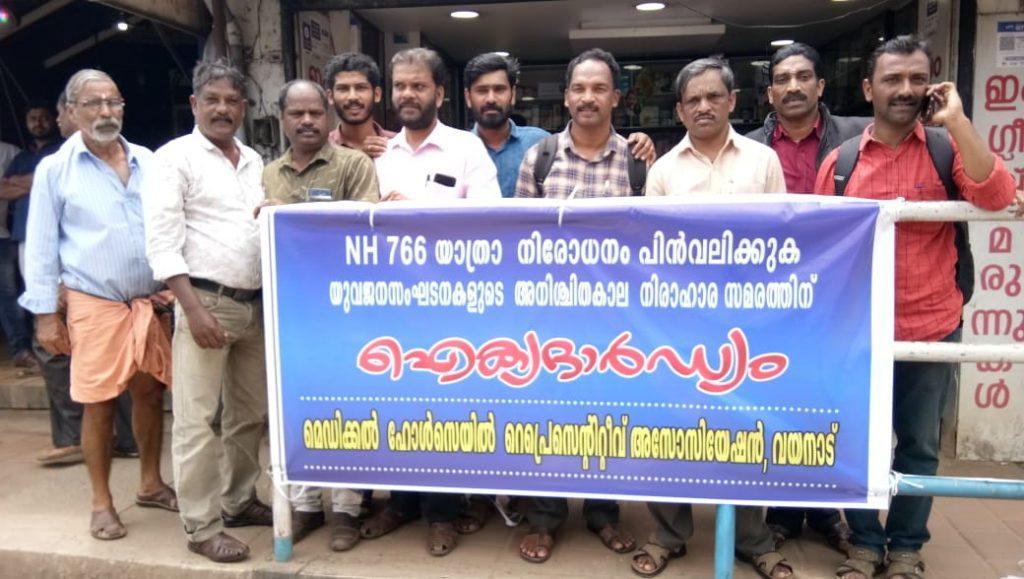 ദേശീയപാത 766 ൽ പതിറ്റാണ്ടുകളായി തുടരുന്ന സഞ്ചാര സ്വാതന്ത്ര്യ നിഷേധത്തിനെതിരെ യുവജന കൂട്ടായ്മ നടത്തുന്ന അനിശ്ചിത കാല നിരാഹാര സമരത്തിന് ഐക്യദാർഡ്യം പ്രകടിപ്പിച്ച് കൊണ്ട് മെഡിക്കൽ ഹോൾസെയിൽ റെപ്രസെന്റേറ്റീവ് അസോസിയേഷൻ വയനാട് ചാപ്റ്ററിന്റെ നേതൃത്വത്തിൽ ബൈക്ക് റാലി സംഘടിപ്പിച്ചു .വയനാടിന്റെ വികസന കുതിപ്പിനെ തടയിടുന്ന രാത്രി യാത്രാ നിരോധനം പിൻവലിക്കണമെന്ന് നേതാക്കൾ ആവശ്യപ്പെട്ടു . പി ജെ ഷാജി , ജെയിംസ് , രാമചന്ദ്രൻ , മുത്തു , സുനീഷ് , ചന്ദ്രൻ തുടങ്ങിയവർ നേതൃത്വം നൽകി