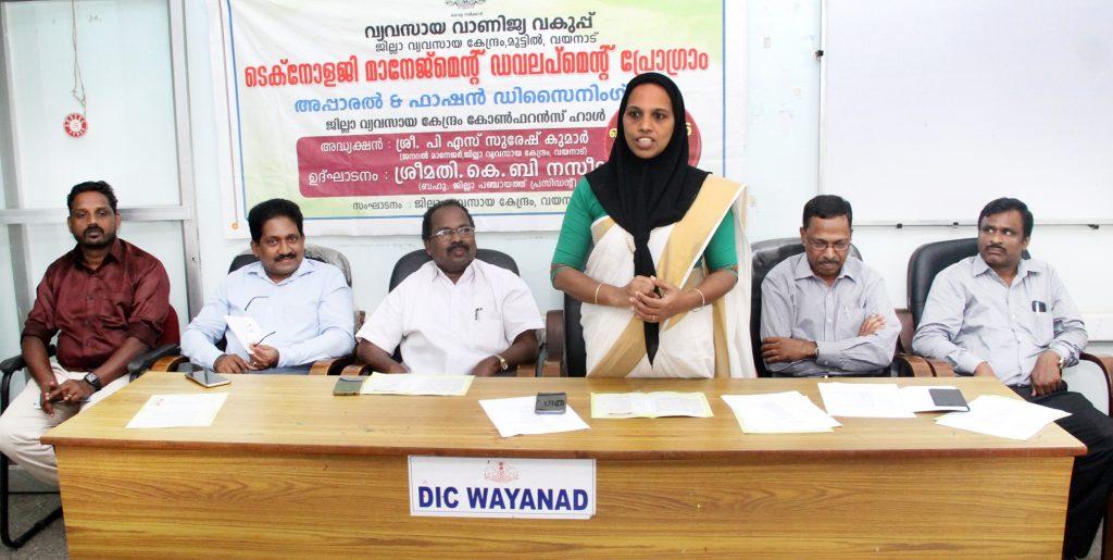 ജില്ലാ വ്യവസായ കേന്ദ്രത്തിന്റെ ആഭിമുഖ്യത്തില് 20 ദിവസം നീണ്ടു നില്ക്കുന്ന ടെക്നോളജി മാനേജ്മെന്റ് ഡവലപ്മെന്റ് പ്രോഗ്രാം (അപ്പാരല് ആന്റ് ഫാഷന് ഡിസൈനിംഗ്) പരിശീലന പരിപാടി ആരംഭിച്ചു. ജില്ലാ പഞ്ചായത്ത് പ്രസിഡന്റ് കെ.ബി നസീമ ഉദ്ഘാടനം ചെയ്തു. ജില്ലാ വ്യവസായ കേന്ദ്രം ജനറല് മാനേജര് പി.എസ് സുരേഷ് കുമാര് അദ്ധ്യക്ഷത വഹിച്ചു. അസിസ്റ്റന്റ് ജില്ലാ വ്യവസായ ഓഫീസര് പി.എസ് കലാവതി, ലീഡ് ബാങ്ക് മാനേജര് ജി വിനോദ്, കെ.എസ്.എസ് ഐ.എ പ്രസിഡന്റ് കെ ഭാസ്ക്കരന്, ജില്ലാ വ്യവസായ കേന്ദ്രം മാനേജര് എ.മുരുഗന്, മാനന്തവാടി അസിസ്റ്റന്റ് ജില്ലാ വ്യവസായ ഓഫീസര് പി.കുഞ്ഞമ്മദ് എന്നിവര് സംസാരിച്ചു.