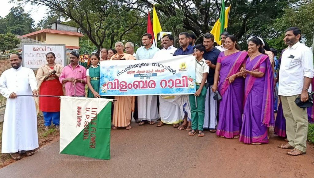 മാനന്തവാടി: ലിറ്റിൽ ഫ്ലവർ യു.പി സ്കൂൾ നവതിയാഘോഷത്തിൻ്റെ ഭാഗമായി നടത്തിയ വർണശബളമായ ഘോഷയാത്ര അമലോത്ഭവ മാതാ ദേവാലയ വികാരി ഫാദർ സെബാസ്റ്റ്യൻ കാരക്കാട്ട് ഫ്ലാഗ് ഓഫ് ചെയ്തു.വാദ്യഘോഷങ്ങളുടെ അകമ്പടിയോടെ 900 ചെറുപുഷ്പങ്ങൾ കൈകളിലേന്തി മാനന്തവാടി ടൗണിലൂടെ നടത്തിയ റാലി ഏവരുടെയും മനം കവർന്നു. നവതിയുടെ ഭാഗമായി കഴിഞ്ഞ 90 വർഷമായി തലയുയർത്തി നിൽക്കുന്ന വിദ്യാലയത്തിൽ അടുത്ത മാസം പൂർവ്വ വിദ്യാർത്ഥി സംഗമം നടത്തുമെന്ന് സംഘാടകർ അറിയിച്ചു.മാനേജർ സിസ്റ്റർ ഷോഭിത, മുനിസിപ്പൽ ചെയർപേഴ്സൺ  ശോഭാ രാജൻ, കൗൺസിലറും പൂർവ്വ വിദ്യാർത്ഥികളുമായ  സ്വപന ബിജു,  ജേക്കബ് സെബാസ്റ്റ്യൻ  റഷീദ് പടയൻ .സ്റ്റെർ വിൻസ്റ്റാനി, മുൻ പി ടി എ പ്രസിഡണ്ടുമാരായ  ജോസ് പുന്നക്കുഴി' അഡ്വക്കറ്റ് ജോസിച്ചൻകോര, .സുനിൽ കെ.ജി.  അമൃതരാജ്' ' യു.എ പൗലോസ്, അഡ്വക്കറ്റ് മണി എന്നിവരും പങ്കെടുത്തു. ഹെഡ്മിസ്ട്രസ് സിസ്റ്റർ നിമിഷ സ്വാഗതവും പിടിഎ പ്രസിഡണ്ടും കൺവീനറുമായ  എം.പി ശശികുമാർ നന്ദിയും പ്രകാശിപ്പിച്ചു.പി ടി എ ഭാരവാഹികൾ അധ്യാപകർ പാരൻ്റ് കൗൺസിൽ അംഗങ്ങൾ എന്നിവർ നേതൃത്വം നൽകി.