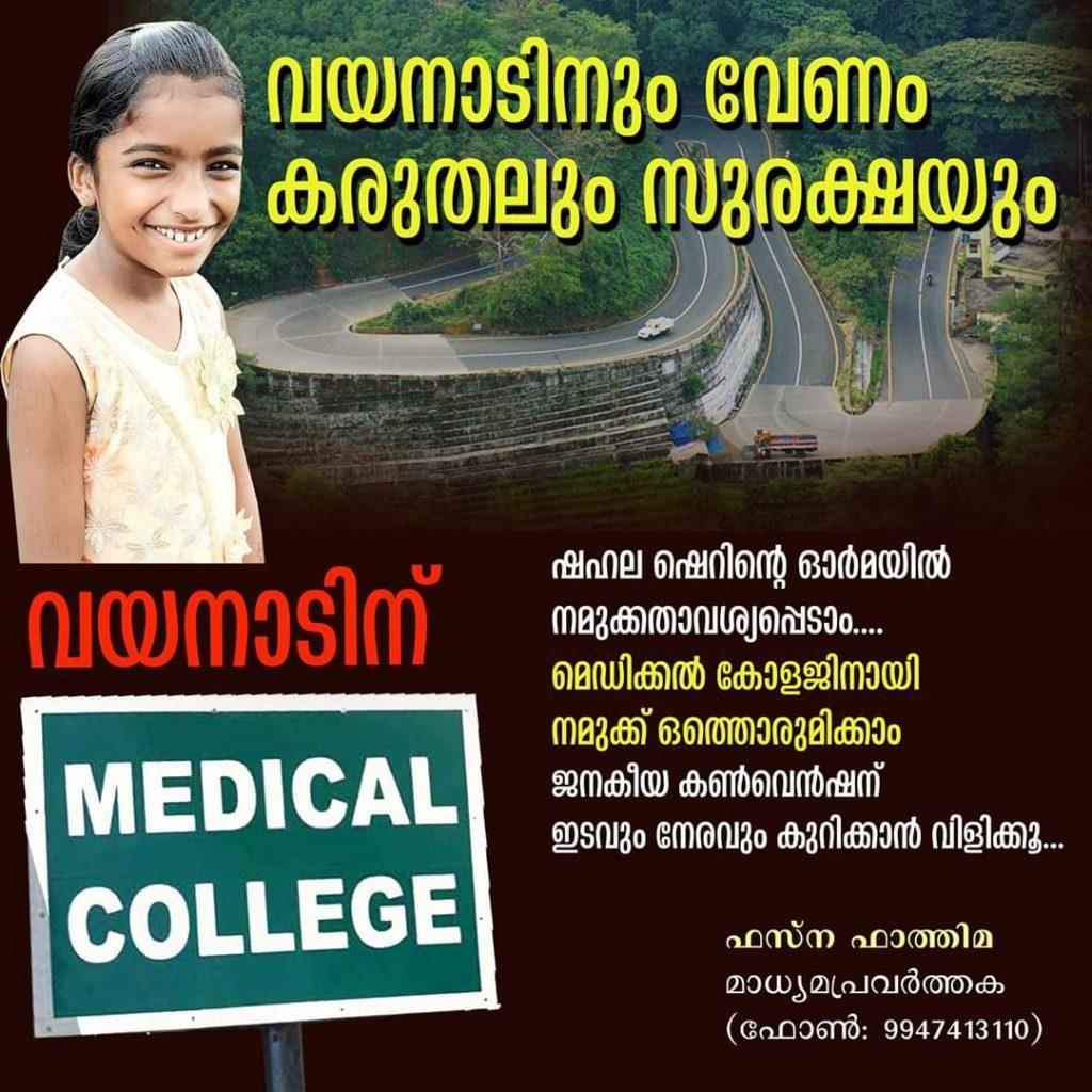 ഷെഹ് ലയുടെ കുടുംബം വയനാട് മെഡിക്കൽ കോളേജിനായി സമരരംഗത്തിറങ്ങുന്നു: ആദ്യപടിയായി ജനകീയ കൺവെൻഷൻ നടത്തും.