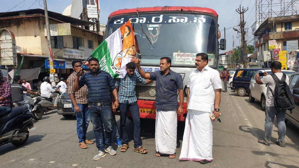 രണ്ട് യുവാക്കളെ പോലീസ് വെടിവെച്ച് കൊലപ്പെടുത്തിയതിൽ പ്രതിഷേധിച്ച് യൂത്ത് കോൺഗ്രസ് പ്രവർത്തകർ കർണാടക ആർ ടി സി ബസ് തടഞ്ഞിട്ടു