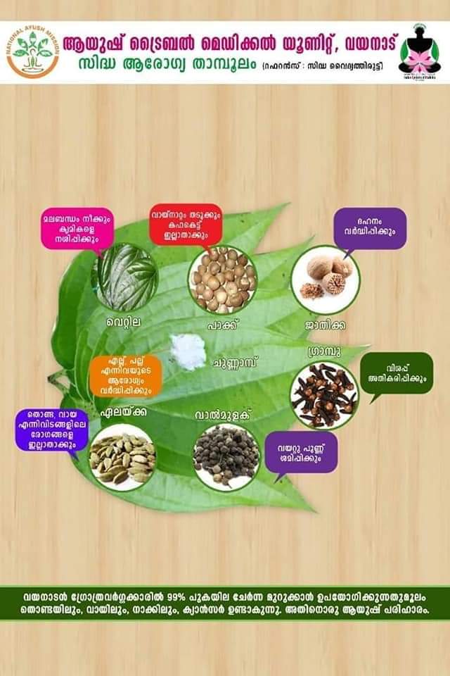 നാളത്തെ കേരളം ലഹരി മുക്ത കേരളം തീവ്രയജ്ഞ ബോധവൽക്കരണ പരിപാടിയുടെ ഭാഗമായി ആയുഷ് ട്രൈബൽ മെഡിക്കൽ യൂണിറ്റിന്റെ നേത്രത്വത്തിൽ മുത്തങ്ങ വന്യ ജീവി സങ്കേതത്തിനുള്ളിലെ ചുക്കാലിക്കുനി കാട്ടു നായിക്ക കോളനിയിൽ ലഹരി വിമുക്ത ബോധവൽക്കരണ ക്ലാസ്സ് നടത്തപ്പെട്ടു. വയനാട്ടിലെ ആദിവാസികളിൽ പുകയില മുറുക്കിന്റെ ഭാഗമായി വായിലും, തൊണ്ടയിലും നാക്കിലു മുള്ള കാൻസർ ധാരാള മായി കണ്ടു വരുന്നു. പുകയില മുറുക്കലിന്റെ ദൂഷ്യ വശങ്ങളെ കുറിച്ചും, പുകയില മുറുക്കലിനെ തടയുന്ന ആയുഷ് മാർഗ്ഗങ്ങളെ കുറിച്ചും ഡോ അരുൺ ബേബി ക്ലാസുകൾ എടുത്തു. പുകയില മുറുക്കിനു ബദൽ ആയുള്ള വെറ്റില, പാക്ക്, ചുണ്ണാമ്പ്, വാൽ മുളക്, ഗ്രാമ്പു, ഏലം, ജാതിക്ക എന്നിവ ചേർന്ന സിദ്ധ ആരോഗ്യ താംബൂലം എല്ലാവർക്കും വിതരണം ചെയ്തു. ഇത് പുകയിലയുടെ ദൂഷ്യ ഫലങ്ങൾ ഒന്നും ഇല്ലാത്തതാണ്. അത് മാത്രമല്ല പുകയിലയോടുള്ള ആസക്തി കുറയ്ക്കുകയും ചെയ്യുന്നു. വായ് നാറ്റം അകറ്റുന്നു, ദഹന ശക്തി വർധിപ്പിക്കുന്നു , വായിൽ വളരുന്ന ഉപദ്രവകാരികളായ സൂക്ഷ്മാണുക്കളെ നശിപ്പിക്കുന്നു, ശ്വാസകോശ രോഗങ്ങൾ ക്കെതിരെ പ്രതിരോധ ശേഷി വർധിപ്പിക്കുന്നു എന്നിങ്ങനെ ഒത്തിരി ഔഷധ ഗുണങ്ങൾ നിറഞ്ഞതുമാണ് സിദ്ധ ആരോഗ്യ താംബൂലം. കൊളോൺ കാൻസർ വരാതെ തടുക്കാൻ വെറ്റിലയ്ക്ക് ഉള്ള കഴിവ് ഇന്ന് ശാസ്ത്ര ലോകം അംഗീകരിക്കപ്പെട്ടിരിക്കുന്നു. സിദ്ധ മെഡിക്കൽ ക്യാമ്പും ഇതോടൊപ്പം നടത്തപ്പെട്ടു.