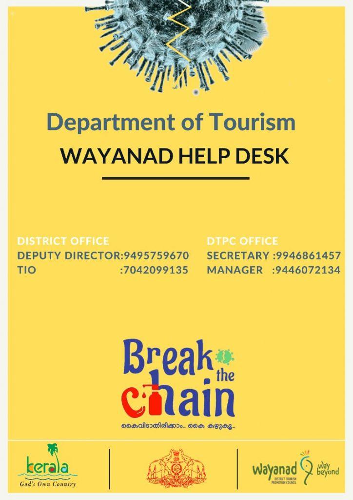 കൽപ്പറ്റ : കൊറോണയുടെ പശ്ചാത്തലത്തിൽ ടൂറിസം മേഖലയിൽ സഹായത്തിനായി ടൂറിസം വകുപ്പ് ഹെൽപ്പ് ഡെസ്ക് ആരംഭിച്ചു. റിസോർട്ടുകളിലോ ഹോംസ്റ്റേകളിലോ കുടുങ്ങിയവർക്കും വിദേശരാജ്യങ്ങളിൽ നിന്ന് എത്തിയവർക്കും ഇതരസംസ്ഥാന കാർക്കും അടക്കം വിനോദസഞ്ചാരവും ആയി ബന്ധപ്പെട്ട ഏതുതരം സഹായത്തിനും താഴെ കാണുന്ന നമ്പറിൽ വിളിക്കാവുന്നതാണ്. 9495759670 / 9446072134.