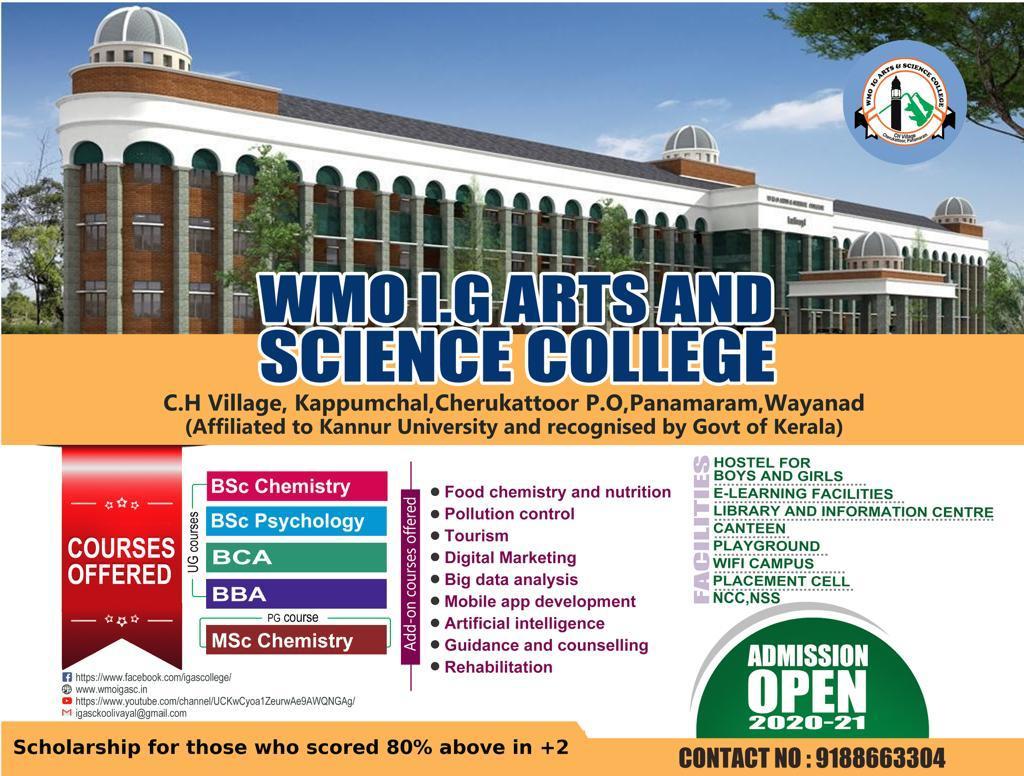 പനമരം. :വയനാട്ടിൽ ബി.എസ്.സി സൈക്കോളജി ഡബ്ള്യു.എം.ഒ ഐ.ജി ആർട്സ് & സയൻസ് കോളേജിൽ മാത്രമാണുള്ളത്. സൈക്കോളജി ബിരുദത്തോടൊപ്പം ഗൈഡൻസ് & കൗൺസലിംഗ്, റിഹാബിലിറ്റേഷൻ എന്നീ വിഷയങ്ങളിൽ ആഡ് ഓൺ കോഴ്സും പഠിക്കാനവസരമുണ്ട്. സ്വദേശത്തും വിദേശത്തും ധാരാളം തൊഴിലവസരങ്ങളാണ് കോഴ്സ് പൂർത്തിയാക്കുന്നവർക്കുന്നവരെ കാത്തിരിക്കുന്നത്. സർക്കാർ പ്രൊജക്റ്റുകളിൽ ആവശ്യത്തിന് കൗൺസലർമാരുടെ നിരവധി ഒഴിവുകളാണുള്ളത്. ബിരുദത്തോടൊപ്പം കൗൺസലിംഗിൽ പ്രായോഗിക പരിശീലനവും കോഴ്സിന്റെ പ്രത്യേകതയാണ്.സൈക്കോ മെട്രിക് ടെസ്റ്റ്, ആപ്റ്റിറ്റ്യൂഡ് ടെസ്റ്റ്, ഐ.ക്യു ടെസ്റ്റ് എന്നിവയിൽ മികച്ച പരിശീലനം നല്കാനുതകുന്ന സുസജ്ജമായ സൈക്കോളജി ലാബ് കോളേജിൽ തയാറാക്കിയിട്ടുണ്ട്. കൂടുതൽ വിവരങ്ങൾക്ക്: