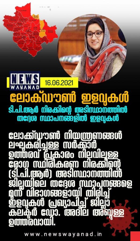 ലോക്ക്ഡൗണ് നിയന്ത്രണങ്ങള് ലഘൂകരിച്ചുള്ള സര്ക്കാര് ഉത്തരവ് പ്രകാരം നിലവിലുള്ള രോഗ സ്ഥിരീകരണ നിരക്കിന്റെ (ടി.പി.ആര്) അടിസ്ഥാനത്തില് ജില്ലയിലെ തദ്ദേശ സ്ഥാപനങ്ങളെ മൂന്ന് വിഭാഗങ്ങളായി തിരിച്ച് ഇളവുകള് പ്രഖ്യാപിച്ച് ജില്ലാ കലക്ടര് ഡോ. അദീല അബ്ദുള്ള ഉത്തരവായി. ടി.പി.ആര് 8 ശതമാനത്തില് താഴെയുള്ള മൂന്ന് ഗ്രാമപഞ്ചായത്തുകളെ എ- വിഭാഗത്തിലും 8 നും 20 നും ഇടയിലുള്ള 21 തദ്ദേശ സ്ഥാപനങ്ങളെ ബി- വിഭാഗത്തിലും 20 നും 30 നും ഇടയിലുള്ള രണ്ട് പഞ്ചായത്തുകളെ സി- വിഭാഗത്തിലും ഉള്പ്പെടുത്തി. 30 നു മുകളില് ടി.പി.ആറുള്ള ഡി- വിഭാഗം ജില്ലയില് നിലവിലില്ല.