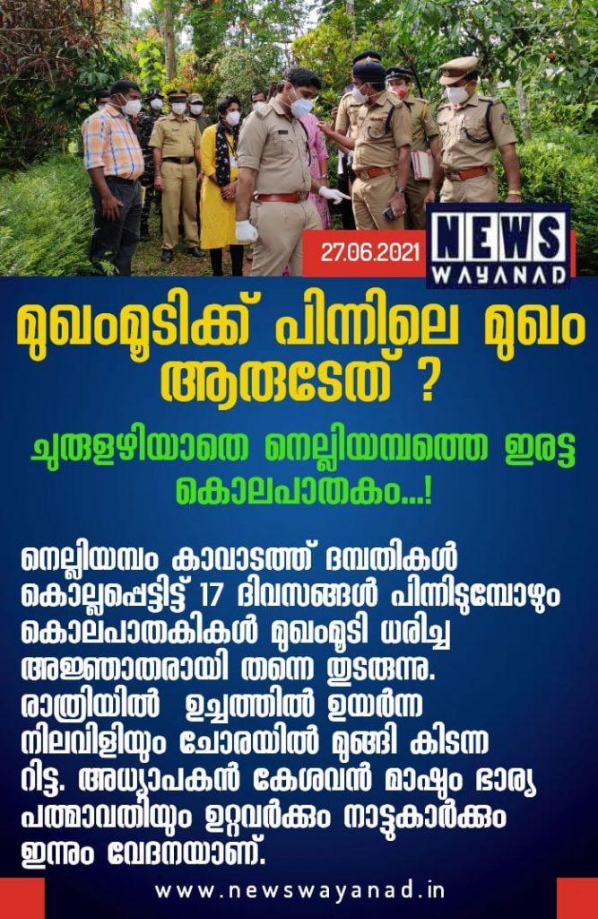 പനമരം: നെല്ലിയമ്പം കാവാടത്ത്‌ ദമ്പതികൾ കൊല്ലപ്പെട്ടിട്ട്‌ 17 ദിവസങ്ങൾ പിന്നിടുമ്പോഴും കൊലപാതകികൾ മുഖംമൂടി ധരിച്ച അജ്ഞാതരായി തന്നെ തുടരുന്നു. രാത്രിയിൽ  ഉച്ചത്തിൽ ഉയർന്ന നിലവിളിയും ചോരയിൽ മുങ്ങി കിടന്ന റിട്ട. അധ്യാപകൻ കേശവൻ മാഷും ഭാര്യ പത്മാവതിയും ഉറ്റവർക്കും നാട്ടുകാർക്കും ഇന്നും വേദനയാണ്. ‍റോഡില് നിന്നും അല്‍പ്പം താഴെയായി കാപ്പിത്തോട്ടത്തിന് നടുവിലെ ഇരുനില വീട്. താഴെത്തെ നിലയിലും, വരാന്തയിലുമെല്ലാം നിറയെ രക്തപ്പാടുകൾ.ഒറ്റ രാത്രിയിൽ ഇല്ലാതായത് 2 ജീവനുകൾ. അതും