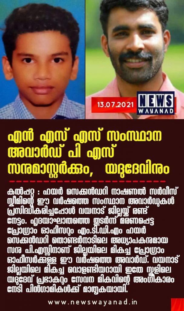 എൻ എസ് എസ് സംസ്ഥാന അവാർഡ് പി എസ് സനുമാസ്റ്റർക്കും, യദുദേവിനും