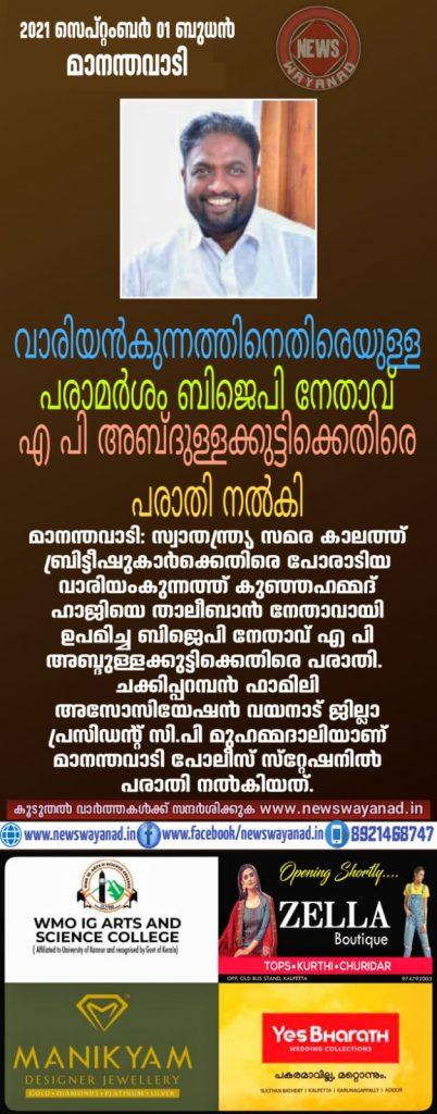 വാരിയന്കുന്നത്തിനെതിരെയുള്ള പരാമര്ശം ബിജെപി നേതാവ് എ പി അബ്ദുള്ളക്കുട്ടിക്കെതിരെ പരാതി നല്കി