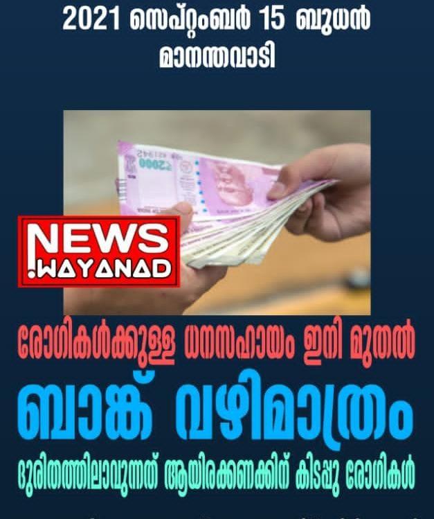 മാനന്തവാടി: സംസ്ഥാനത്ത് റവന്യുവകുപ്പിന് കീഴില്‍ മണിഓര്‍ഡറായി ഗുണഭോക്താക്കള്‍ക്ക് അയച്ചിരുന്ന കാന്‍സര്‍, ടിബി രോഗികള്‍ക്കുള്ള പ്രതിമാസ ധനസഹായം ബാങ്ക് അക്കൗണ്ട് വഴിമാത്രം നല്‍കാന്‍ നിര്‍ദ്ദേശം. ഇതോടെ മരണാസന്നരായി കഴിയുന്ന രാേഗികള്‍ക്ക് പ്രതിമാസം ലഭിക്കുന്ന ആയിരം രൂപ കൈപ്പറ്റാനായി ബേങ്കുകളിലേക്ക് പോവേണ്ട സാഹചര്യമാണുണ്ടാവുന്നത്.പ്രതിവര്‍ഷം ഒരു ലക്ഷത്തില്‍ താഴെ മാത്രം വരുമാനമുള്ള കുടുംബങ്ങളിലെ കാന്‍സര്‍,ടിബി രോഗികള്‍ക്ക് റവന്യുവകുപ്പ് മുഖേനമല്‍കി വന്നിരുന്ന ധനസഹായമാണ് സെപ്തംബര്‍ മുതല്‍ ബാങ്കക്കൗണ്ട് മുഖേനമാത്രം നിര്‍ദ്ദേശിച്ചിരിക്കുന്നത്.വയനാട് ജില്ലയില്‍ മൂന്ന് താലൂക്കുകളിലായി മാത്രം രണ്ടായിരത്തിലധികം പേരാണ് സര്‍ക്കാരില്‍ നിന്നുള്ള ഈസഹായം കൈപ്പറ്റുന്നത്.