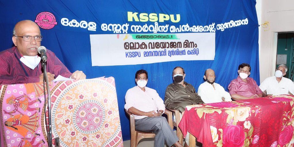 മാനന്തവാടി : കേരള സ്റ്റേറ്റ് സർവ്വീസ് പെൻഷനേഴ്സ് യൂണിയൻ മാനന്തവാടി മുൻസിപ്പൽ കമ്മിറ്റിയുടെ ആഭിമുഖ്യത്തിൽ ലോക വയോജന ദിനം സമുചിതമായി ആചരിച്ചു. മാനന്തവാടി ബ്ലോക്ക് റിസോഴ്സ് സെന്ററിൽ കോവിഡ് മാനദണ്ഡം അനുസരിച്ച് ചേർന്ന യോഗത്തിൽ വയനാട് ഗവ. മെഡിക്കൽ കോളേജ് പ്രിൻസിപ്പാൾ ഡോ.കെ.കെ. മുബാറക്ക് വയോജന ദിന സന്ദേശം / മുഖ്യപ്രഭാഷണം നടത്തി. KSSPU വയനാട് ജില്ലാ പ്രസിഡണ്ട് പി. രാജൻ ഉദ്ഘാടനം ചെയ്ത യോഗത്തിൽ മുൻസിപ്പൽ കമ്മിറ്റി പ്രസിഡന്റ് കെ.ജമാലുദ്ദീൻ കുട്ടി അദ്ധ്യക്ഷത വഹിച്ചു. മുൻസിപ്പൽ കമ്മിറ്റി സെക്രട്ടറി കെ.സി.നാരായണൽ സ്വാഗതവും വനിതാവേദി കൺവീനർ കെ.കെ.സൈനബ നന്ദിയും പറഞ്ഞു. ഡോ.കെ.ഗോകുൽദേവ്, എ.കെ. മോസസ് എന്നിവർ പ്രസംഗിച്ചു.