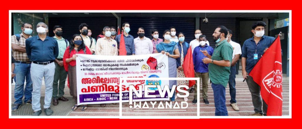 പൊതു മേഖലാ ബാങ്കുകളെ സംരക്ഷിക്കുക. ജനകീയ ബാങ്ക് നിലനിര്ത്തുക, തുടങ്ങിയ ആവശ്യങ്ങള് ഉന്നയിച്ചാണ് അഖിലേന്ത്യാ ബാങ്ക് പണിമുടക്ക് നടത്തുന്നത്. ജില്ലയില് നടന്ന ധര്ണ്ണ യു എഫ് ബി യു ജില്ലാ സെക്രട്ടറി പി.ബാലകൃഷ്ണന് ഉല്ഘാടനം ചെയ്തു. എ കെ ബി എഫ് ജില്ലാ ചെയര്മാന് ടി.വി മുരളി അദ്ധ്യക്ഷത വഹിച്ചു. എ ഐ ബി ഒ സി ജില്ലാ പ്രസിഡന്റ് ശ്രീമതി അശ്വതി കെ.ജി. എന് സി ബി ഇ ജില്ലാ സെക്രട്ടറി സുമോദ് എം.കെ, . പി.ജെ ജോയി തുടങ്ങി യവര് സംസാരിച്ചു.
