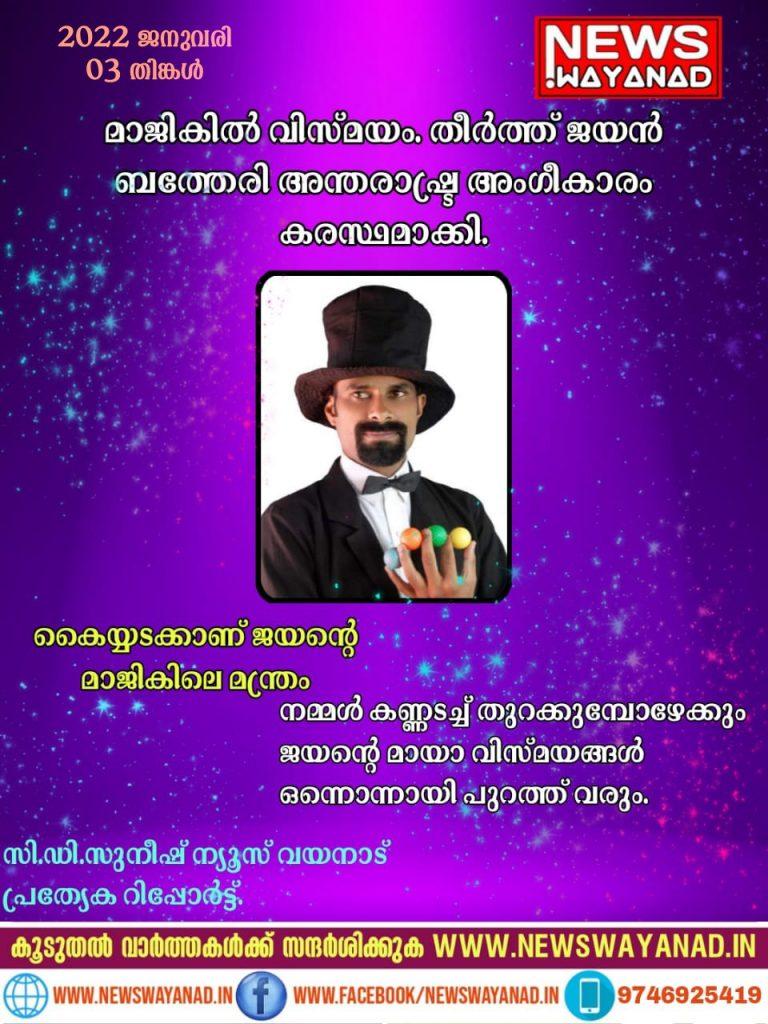 മാജികിൽ വിസ്മയം തീർത്ത് ,ജയൻ ബത്തേരി അന്തരാഷ്ട്ര അംഗീകാരം കരസ്ഥമാക്കി