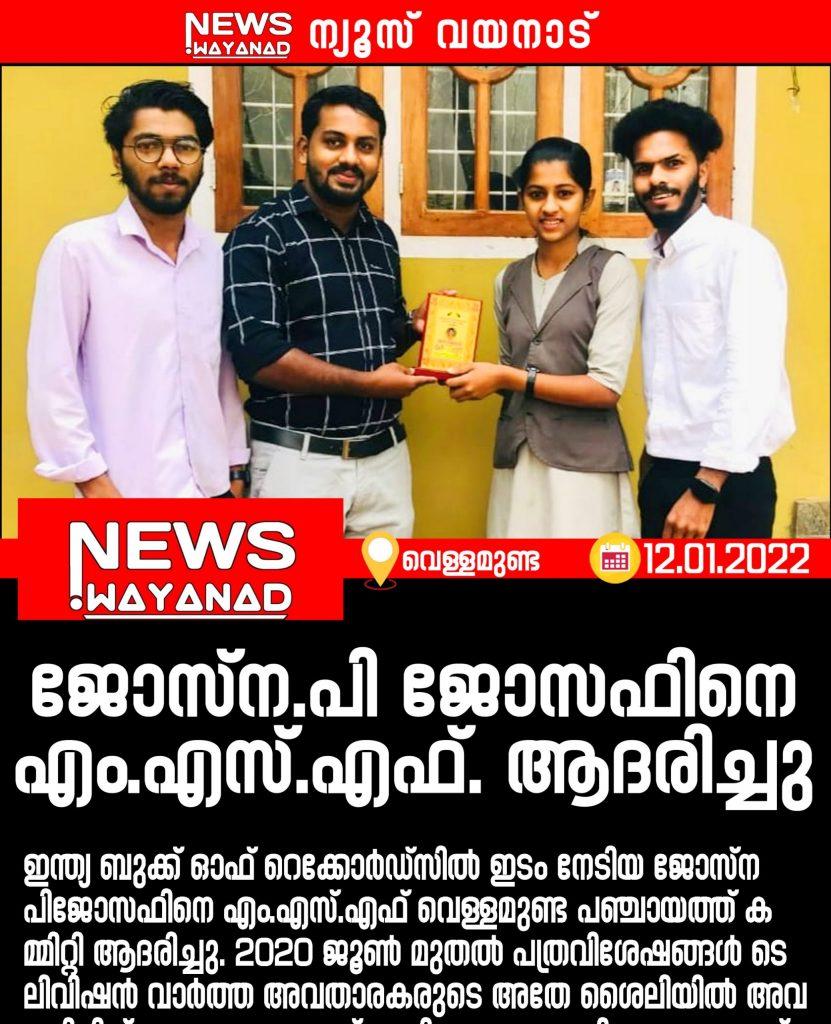 വെള്ളമുണ്ട: ഇന്ത്യ ബുക്ക് ഓഫ്റെക്കോർഡ്സിൽ ഇടം നേടിയ ജോസ്ന പി ജോസഫിനെ എം.എസ്.എഫ് വെള്ളമുണ്ട പഞ്ചായത്ത് കമ്മിറ്റി ആദരിച്ചു.