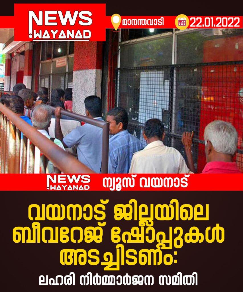 വയനാട് ജില്ലയിലെ ബീവറേജ് ഷോപ്പുകൾ അടച്ചിടണം: ലഹരി നിർമ്മാർജന സമിതി