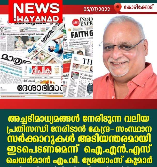 അച്ചടിമാധ്യമങ്ങൾ നേരിടുന്ന വലിയ പ്രതിസന്ധി നേരിടാൻ കേന്ദ്ര-സംസ്ഥാന സർക്കാറുകൾ അടിയന്തരമായി ഇടപെടണമെന്ന് ഐ.എൻ.എസ് ചെയർമാൻ എം.വി. ശ്രേയാംസ് കുമാർ