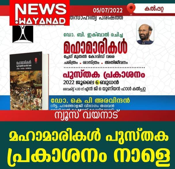 കൽപ്പറ്റ: ഡോ. ബി ഇക്ബാൽ രചിച്ച് കേരള ശാസ്ത്ര സാഹിത്യ പരിഷത്ത് പ്രസിദ്ധീകരിച്ച മഹാമാരികൾ, പ്ലേഗ് മുതൽ കോവിഡ് വരെ എന്ന പുസ്തകത്തിന്റെ പ്രകാശനം നാളെ (ജൂലൈ 6 ന് ) വൈകീട്ട് 4 മണിക്ക് കൽപ്പറ്റ എൻ.ജി.ഒ. യൂണിയൻ ഹാളിൽ വച്ച് പ്രകാശനം ചെയ്യും. ഡോ. കെ പി അരവിന്ദൻ ( റിട്ടയേഡ് പ്രൊഫസർ കോഴിക്കോട് മെഡിക്കൽ കോളേജ് ) പ്രകാശനം നിർവഹിക്കുകയും പുസ്തകത്തെ പരിചയപ്പെടുത്തി പ്രഭാഷണം നടത്തുകയും ചെയ്യും.വയനാട് ഡി.എം ഒ . ഡോ. ഒ സക്കീന പുസ്തകം ഏറ്റു വാങ്ങും.പരിഷത്ത് ജില്ലാ പ്രസിഡന്റ് കെ വിശാലാക്ഷി അധ്യക്ഷത വഹിക്കും.