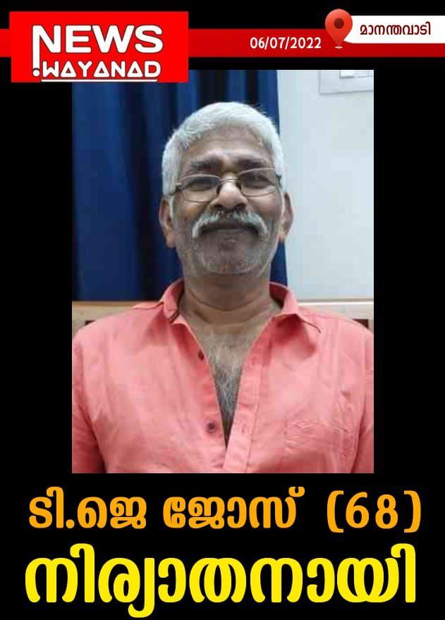 മാനന്തവാടി: കല്ലുമൊട്ടൻകുന്ന് തേനാലിൽ റ്റി.ജെ ജോസ് (68) നിര്യാതനായി. ഭാര്യ: ഗ്രേസി. മക്കൾ: ഷൈന, നോബിഷ് (ഡി.ഡി.ഇ ഓഫീസ്, വയനാട്). മരുമക്കൾ: ബിജു, ലിഞ്ജു (അധ്യാപിക, ഗാന്ധി മെമ്മോറിയൽ യു.പി. അഞ്ചു കുന്ന്). സംസ്കാരം നാളെ രാവിലെ 10.00 ന് മാനന്തവാടി അമലോത്ഭവ മാതാ ദേവാലയ സെമിത്തേരിയിൽ.