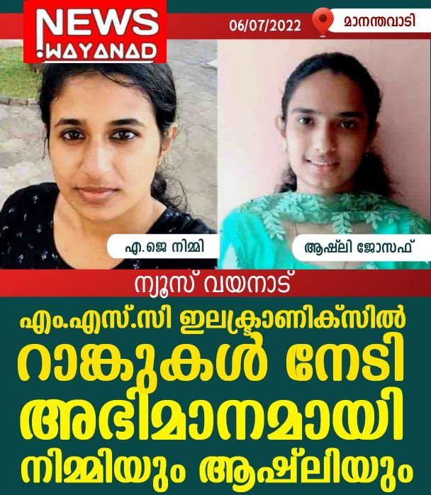 എം.എസ്.സി ഇലക്ട്രാണിക്സിന് റാങ്കുകൾ:അഭിമാനമായി നിമ്മിയും ആഷ്ലിയും
