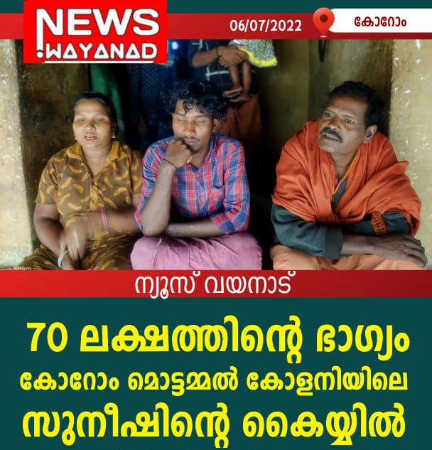 നിർമ്മൽ ഭാഗ്യക്കുറിയുടെ ഒന്നാം സമ്മാനം 70 ലക്ഷം രൂപ കോറോം മൊട്ടമ്മൽ കോളനിയിലെ അതിരംപാറ ചന്ദ്രൻറെ മകൻ സുനീഷ് എടുത്ത ടിക്കറ്റിന് . ഒന്നാം സമ്മാനം അടിച്ചതിന്റെ അമ്പരപ്പിലും സന്തോഷത്തിലുമാണ് സുനീഷും കുടുംബവും
