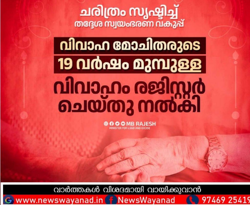 വിവാഹരജിസ്ട്രേഷനില്‍ ചരിത്രം സൃഷ്ടിച്ച് വീണ്ടും തദ്ദേശ സ്വയം ഭരണ വകുപ്പ് വിവാഹമോചിതരായ ദമ്പതികളുടെ ആദ്യവിവാഹം 19 വര്‍ഷത്തിന് ശേഷം രജിസ്റ്റര്‍ ചെയ്തു