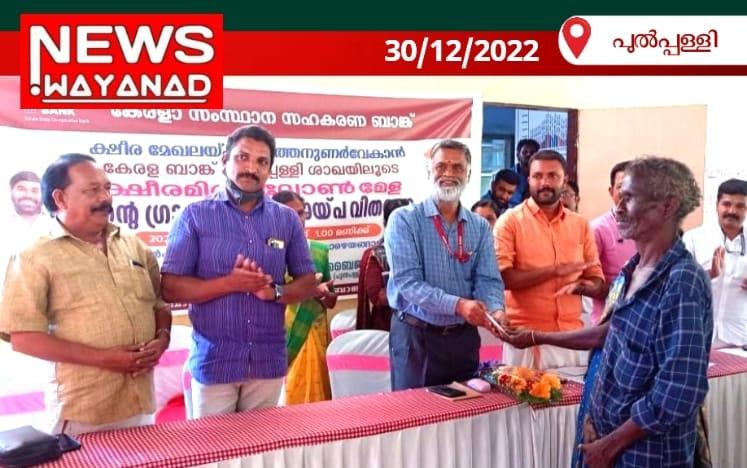 പുൽപ്പള്ളി : ക്ഷീര കർഷകർക്ക് ഒരു കോടി രൂപ വായ്പ ഒറ്റ ദിവസം കൊണ്ട് നൽകി കേരള ബാങ്ക് പുൽപള്ളി ശാഖ. പുല്പള്ളി ക്ഷീര സംഘത്തിൽ വെച്ചു നടന്ന ചടങ്ങിൽ ആണ് തുക വിതരണം ചെയ്തത്. ഈടില്ലാതെ രണ്ട് ലക്ഷം രൂപ വരെ വ്യക്തിഗത വായ്പ ലഭ്യമാവുന്ന ക്ഷീര മിത്ര ലോൺ ആണ് വിതരണം നടത്തിയത്. ഇതിന് ഖാദി ബോർഡ് സബ്‌സിഡി അനുവദിക്കും.25 ശതമാനം മുതൽ 40 ശതമാനം വരെ സബ്‌സിഡി ലഭിക്കും.പരിപാടി കേരള ബാങ്ക് ഡി ജി എം നവനീത് കുമാർ ഉദ്‌ഘാടനം ചെയ്തു. പുല്പള്ളി ക്ഷീര സംഘം പ്രസിഡന്റ്‌ ബൈജു നമ്പിക്കൊല്ലി അധ്യക്ഷത വഹിച്ചു.വിനോദ് (ഖാദി ബോർഡ് ),ജോഷി ചാരുവേലിൽ, മാത്യു മത്തായി,സനൽ കുമാർ,ടി ജെ ചാക്കോച്ചൻ, മോളി ജോർജ്, യു എൻ കുശൻ, എം ആർ ലതിക തുടങ്ങിയവർ സംസാരിച്ചു.കേരള ബാങ്ക് ഏരിയ മാനേജർ സുജാമണി പി പി സ്വാഗതവും ബ്രാഞ്ച് മാനേജർ വിജി മോൾ പി എസ് നന്ദിയും പറഞ്ഞു.