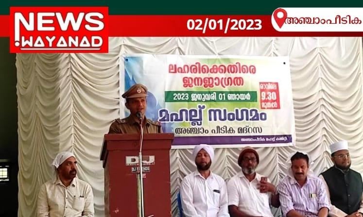 അഞ്ചാംപീടിക:ലഹരിക്കെതിരെ ജന ജാഗ്രത എന്ന ശീർഷകത്തിൽ അഞ്ചാംപീടിക മഹല്ല് കമ്മിറ്റിയുടെ നേതൃത്വത്തിൽ മഹല്ല് ജാഗ്രത സംഗമം സംഘടിപ്പിച്ചു.വെള്ളമുണ്ട പ്രിൻസിപ്പൽ എസ്.ഐ കെ.എ ഷറഫുദ്ദീൻ ഉദ്ഘാടനം ചെയ്തു.ജീവിതമാണ് ലഹരി' എന്ന വിഷയത്തിൽ സിവിൽ എക്സൈസ് ഓഫീസർ വിജേഷ് കുമാറും, 'ലഹരിക്കാലത്തെ രക്ഷാകർതൃത്വം' സൈക്കോളജിസ്റ്റ് സഫ് വാൻ അസ്ഹരിയും അവതരിപ്പിച്ചു.പ്രസിഡണ്ട് വി മമ്മൂട്ടി ഹാജിഅദ്ധ്യക്ഷത വഹിച്ചു.അബ്ദുൽ മജീദ് ദാരിമി, എസ് ശറഫുദ്ദീൻ, കെ റഫീഖ്, എസ് അബ്ദുല്ല, വി ഇബ്രാഹിം ഫൈസി, അഹ്മദ് സഖാഫി,വി ഉസ്മാൻ എന്നിവർ നേതൃത്വം നൽകി.